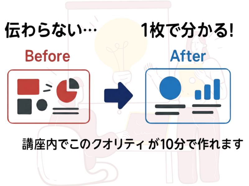 伝わるスライドを作れず時間だけが消える…そんな悩みを解消し、Gammaで“1枚で価値が伝わる資料”をすぐに使える形で講座中に仕上げる👍