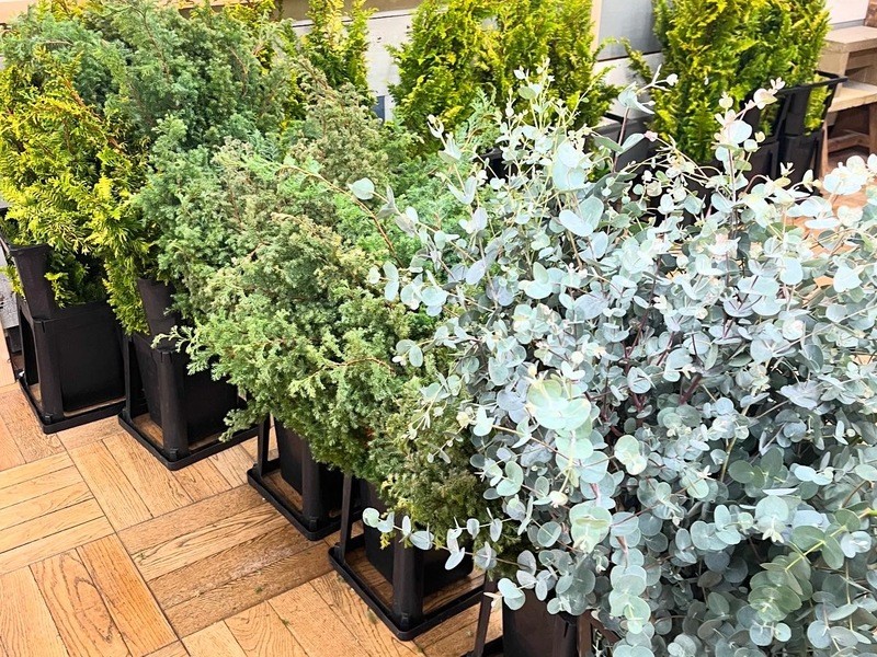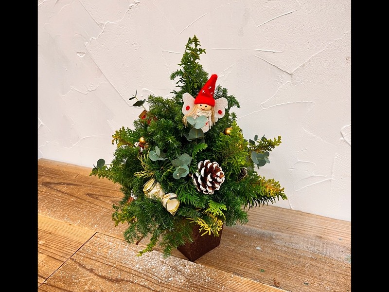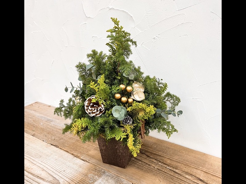 クジャクヒバやヒムロスギなど本物の木を使って作るクリスマスツリーです。