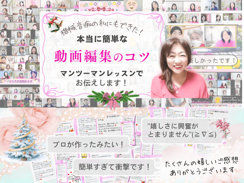 全く初心者の私に Michiko 先生は寄り添ってくださって、とても親切に教えてくださったので、本当に素晴らしい動画が作れて、とても嬉しいです。