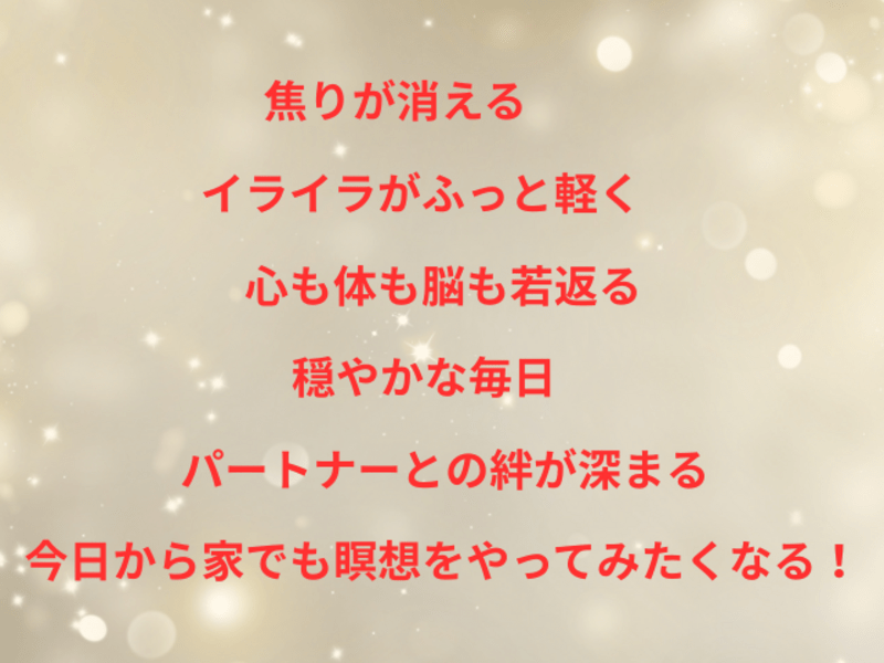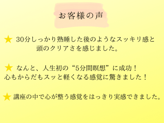 受講後、数日間ですが朝と夜に自分でもやってみています。一人だとまだ雑念が湧いてうまくできない時もありますが、それでも終わった後は気持ちがスッと落ち着くのを実感しています。