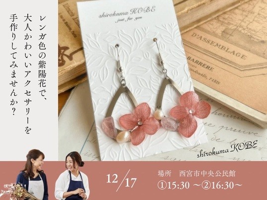 深みのある秋色に染まった紫陽花と天然石を使って、大人可愛いピアス・イヤリングを作るワークショップです