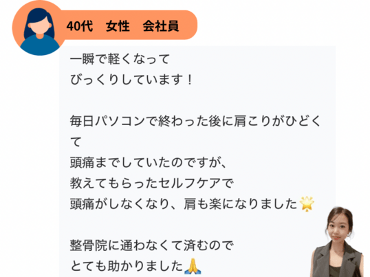 肩こりがひどく、頭痛が出るほどつらかったため、今回受講させていただきました😣