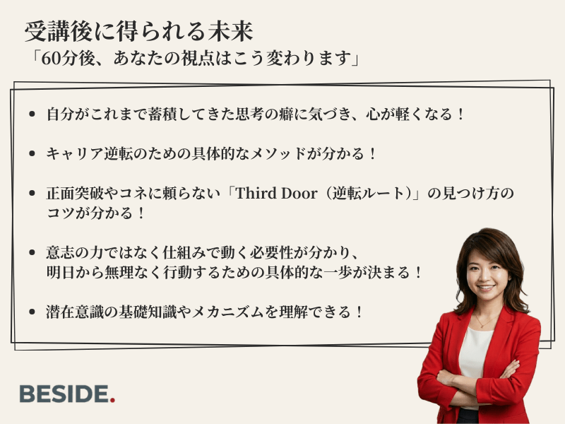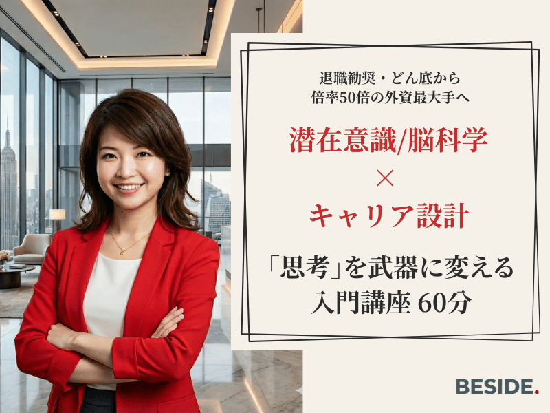 一見、華やかに見えるかもしれませんが、私の原点は泥臭い挫折にあります。学生時代の学歴コンプレックス、社会人でのパワハラと退職勧奨。一度は全否定され絶望しましたが、そこが転換点でした。どん底から這い上がる過程で見つけたのは、思考の死角に隠れていた「Thi...