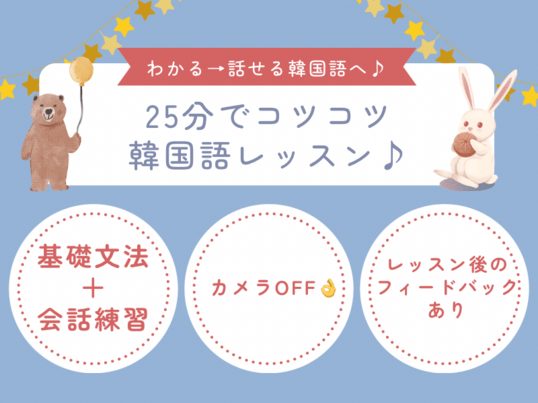 韓国語スクールで講師を経験後、現在はオンラインで10歳〜60代の方と楽しくレッスンをしています。