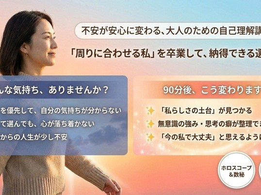 ホロスコープと数秘を組み合わせて自己理解を深めていく点がとても興味深く、初めてでも安心して参加できる講座でした。終始、共感しながら丁寧に話を聴いてくださり、どんな気持ちも否定せず受け止めてもらえたことに、とても安心感がありました。