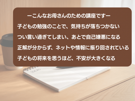 この講座では、勉強法を詰め込む前に、まずお母さん自身の心を整えることを...