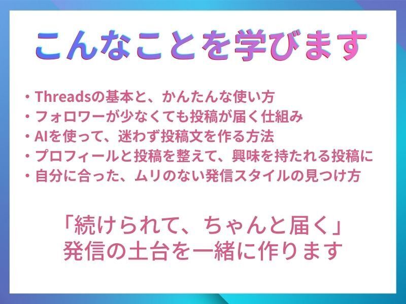 スレッズの良さは聞いているものの、自分にどう生かせばいいのかわからなかったので受講させていただきました
