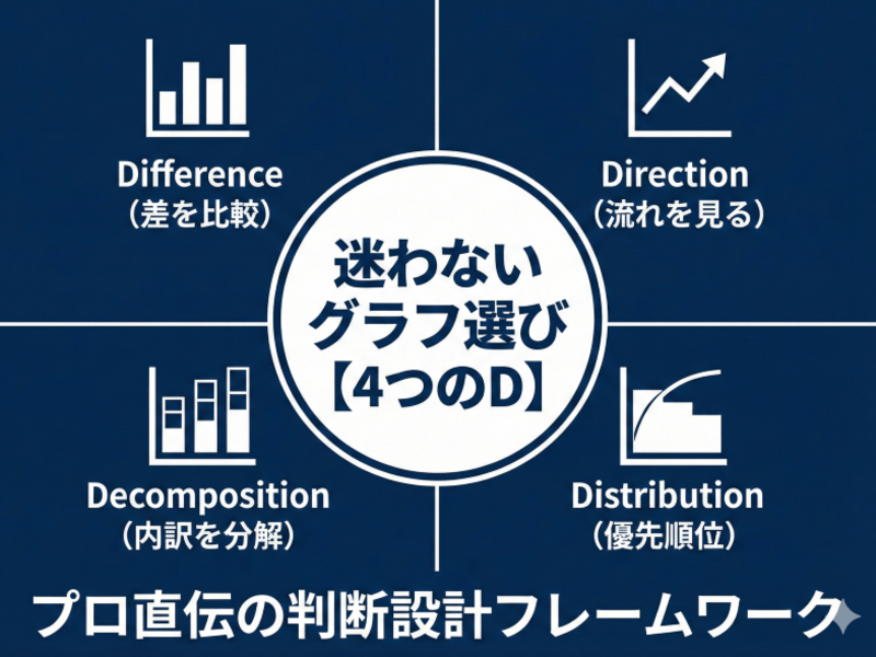 本講座では、難しい統計知識や高度なExcel関数は使いません。 以下の「4つのD」というフレームワークに当てはめるだけで、誰でも迷わず最適なグラフが作れるようになります。