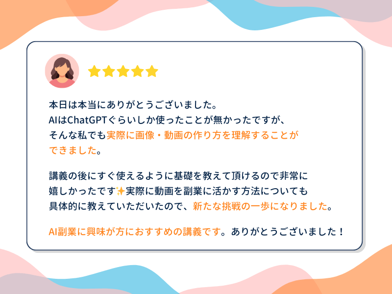 講座が終わってすぐに、家族や友人にも「これは本当に良い講座だから、ぜひ受けてみて!」と熱く語ってしまいました。AI副業の全体像が分かり、自分にもできることがたくさんあるのだと希望が持てました。この歳になって新しいことに挑戦する楽しさを教えていただき、先生には心から感謝しております。本当にありがとうございました。