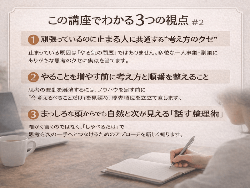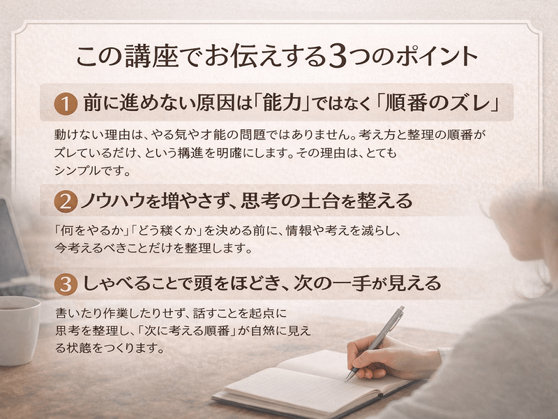 「一人で事業や発信を抱え込み、考えがまとまらず止まってしまう状態」を整理するサポートをしてきました。