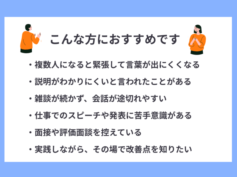 実際に相手に伝わる話し方がどのようなものかを知って、意識して話す練習をする中で、自分の話し方の癖や特徴などを分析していただき、他にどのような言葉がよいのかなどを考えることができました。また受講したいです。