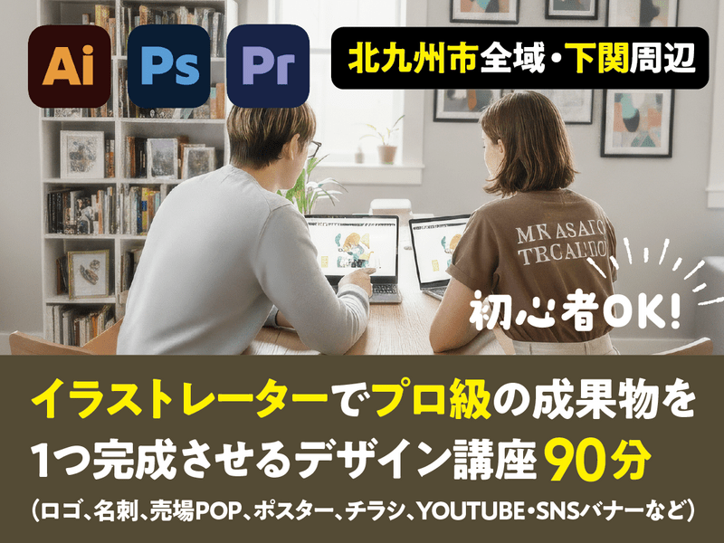 ロゴ、名刺、売場POP、告知ポスター、チラシなど。好きな時間に好きな場所で。デザインの基礎から応用まで、家庭教師のように丁寧にお教えします。