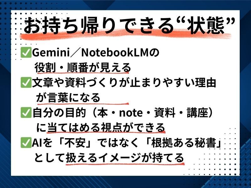 NotebookLMとGeminiの連携のコツを、入り口だけでも学べてよかったです。