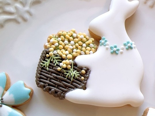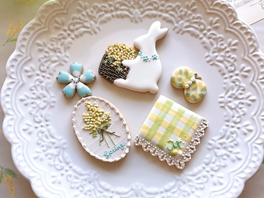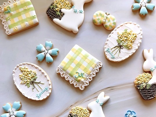 幸せを呼ぶミモザと、可憐なネモフィラを散りばめ、美しく立体感のある花かご編みを学べる春満載のアイシングレッスンです♫