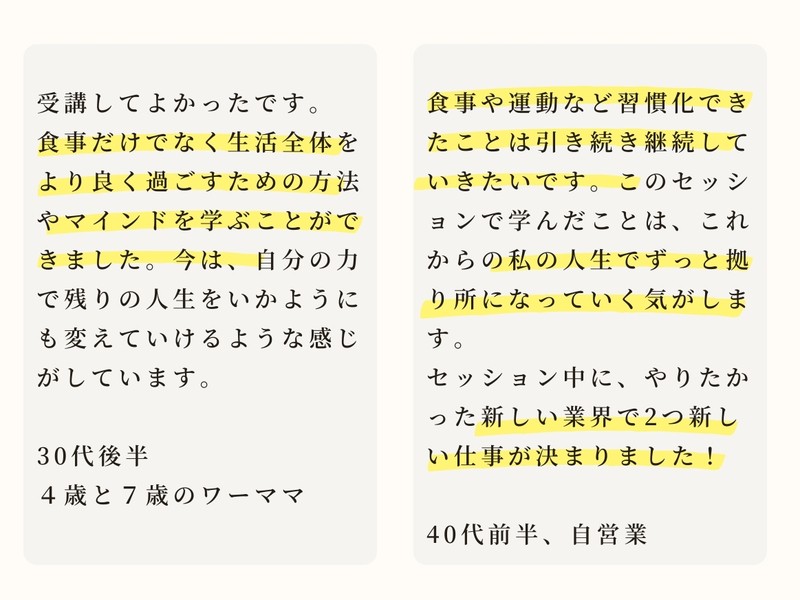 食事や生活習慣、心の整え方を実践する中で、体調やライフスタイルが大きく変化し、長年の体型コンプレックスも改善(体重は合計20kg減)