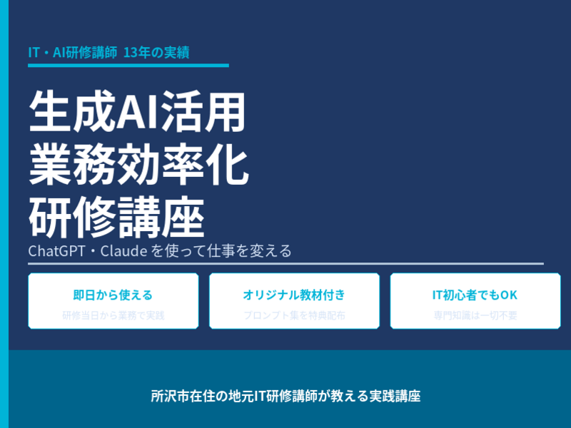 「難しいことをわかりやすく、その日から使える形で伝える」をモットーに、IT未経験の新入社員から管理職・シニア層まで幅広い層への指導を得意としています。
