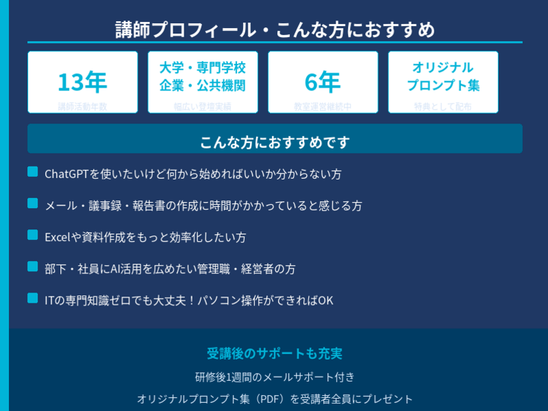 2012年より個人事業主として、大学・専門学校・中小企業・大手上場企業・公共機関・行政機関など幅広いフィールドでビジネスパソコン研修の講師を務め、今年で13年目を迎えます。
