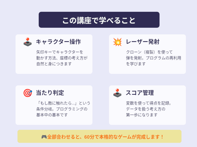 レッスンでは、Scratchでのゲーム作りから...