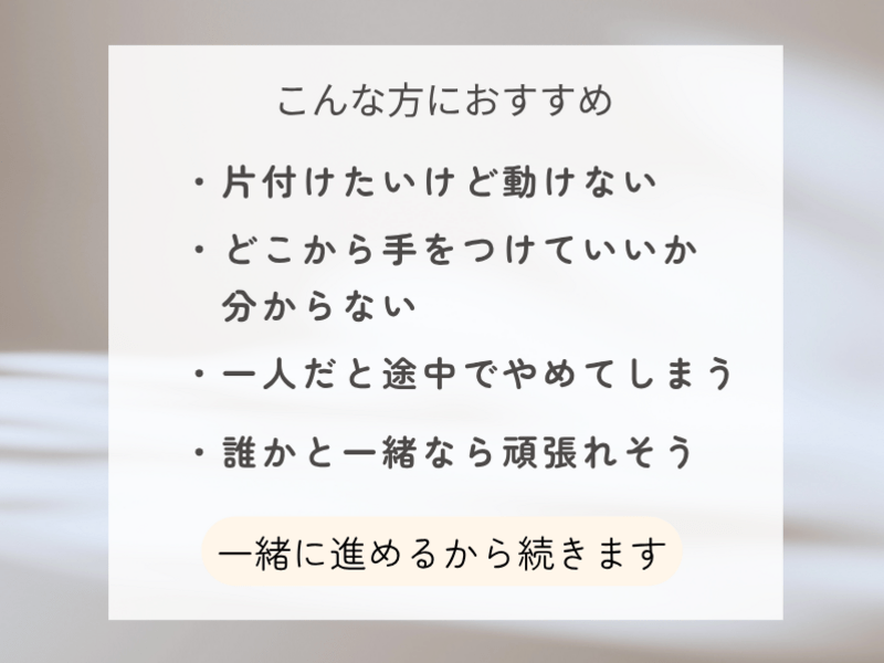 ひとりだと進まない片付けも、一緒にやることで自然と前に進みます。2時間で“少し整う”体験を。