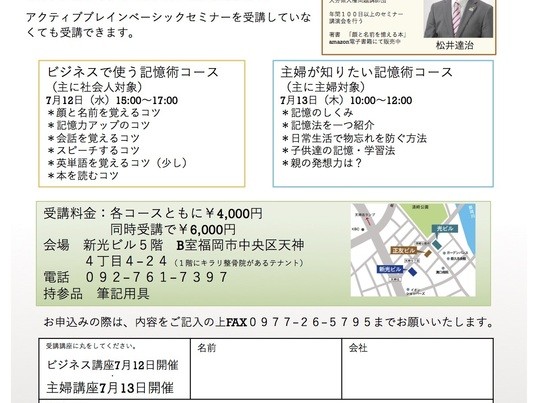 記憶力アップすることによって、自分の記憶力に自信が持てる、自分の人生に自信が持てる。受講生は小学校5年生から70代の方まで受講いただいている。受験勉強や資格試験はなどに生かすのは勿論ですが、発想力や...