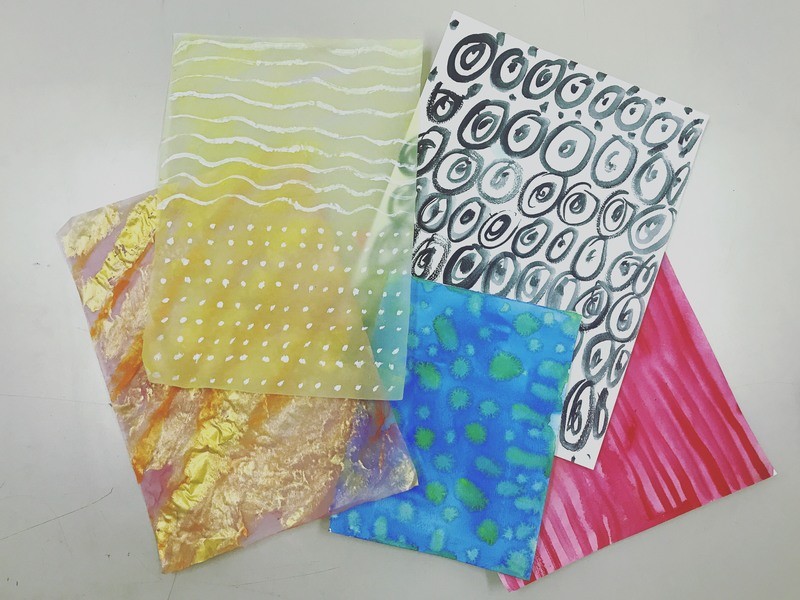 水彩絵の具でオリジナルの様々な模様の色紙を作って、動物やイメージの形に色紙をコラージュしてみましょう!