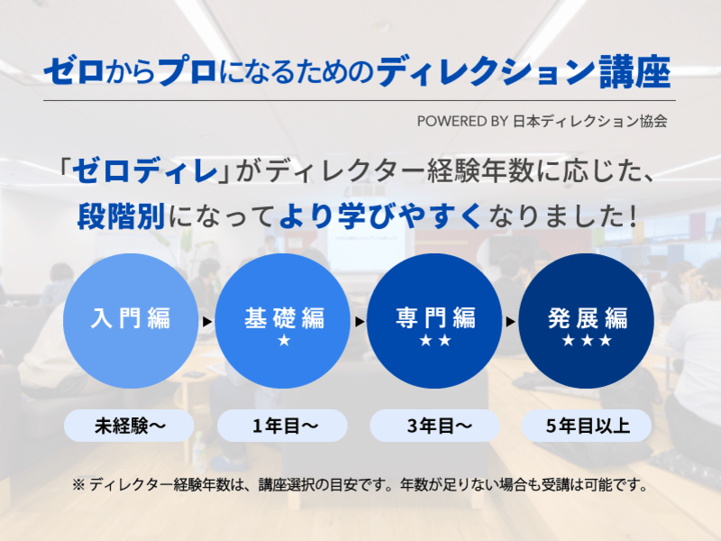 「ゼロディレ:ゼロからプロになるためのディレクション講座」は、「明日から役立つディレクションノウハウを伝える」をコンセプトに、受講者の方のディレクションの段階やニーズに応じて、「その時、必要なこと」をさまざまな講座を通じてステップアップ形式で提供しています。