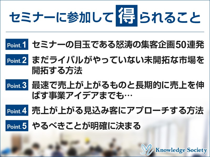 SEOやアフィリエイトといったネット上の基本的な販促から、最新の販促、さらには身近な郵便局や駅広告の効果的な活用法まで、50以上の集客方法が網羅された中身の濃いセミナーです。