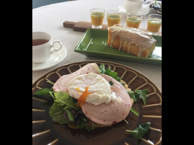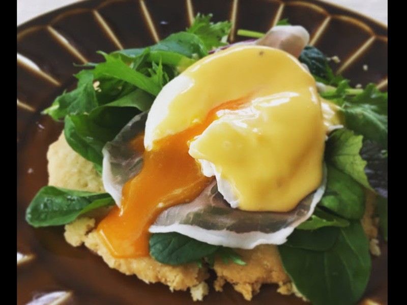 今回は焼いた生地の上にグリーンサラダ、生ハム、ソーセージ、ポーチドエッグをのせていただきました。ポーチドエッグも作りました。具材はいろいろ変えて楽しめそうです。見た目おしゃれでおうちでのランチ会などにいいと思いました。