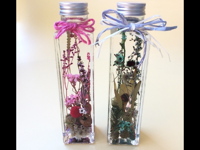 形の異なる数種のボトルでの、それぞれに美しく見せるハーバリウムの制作のコツを学びます。