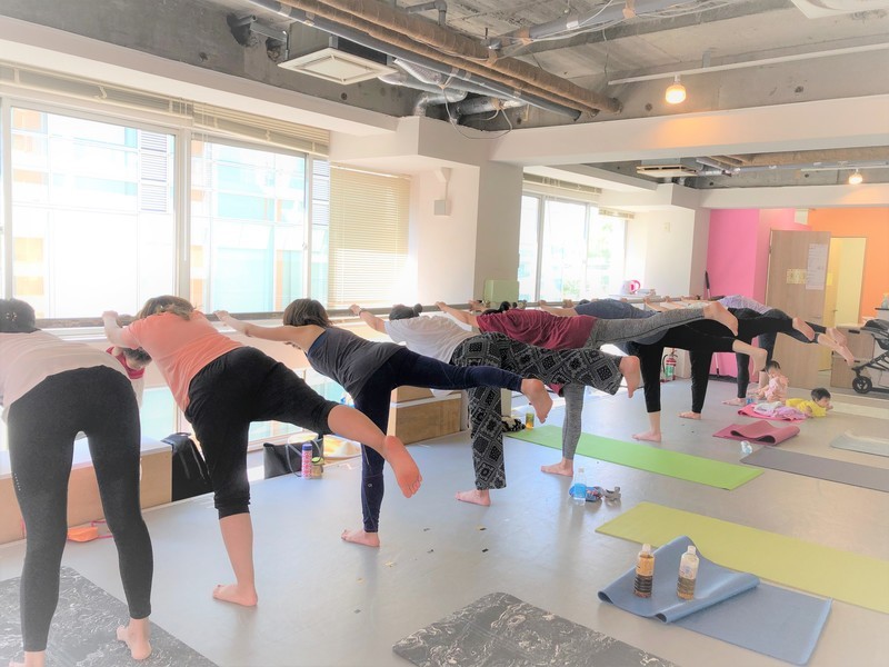 初心者向けのママヨガ(産後ヨガ)です。バレエバーを使って産後ママの腰肩の痛みを解消■ベビーフォト撮影付きコースも人気■大森駅徒歩5分