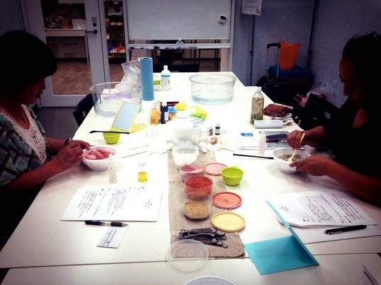クレイバスについての理論のの実際にクレイバスに浸かって体感してもらいます。バスボムやバスソルトの作成をします。