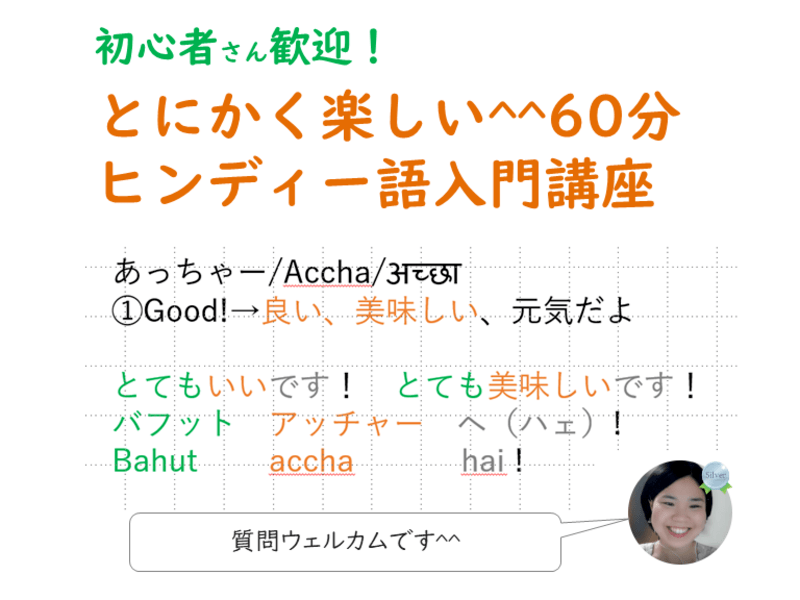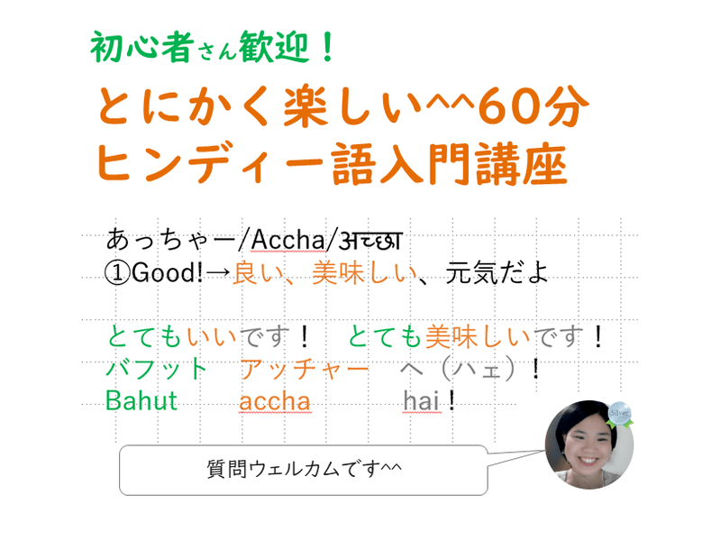 インドに旅行に行ったら必ず使える表現をわかりやすく教えてくれます。先生はとてもフレンドリーですので、何でも質問できます。インドに興味がある方に超オススメのクラス!