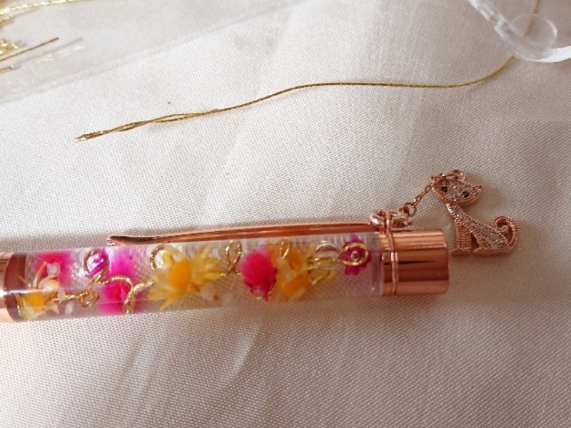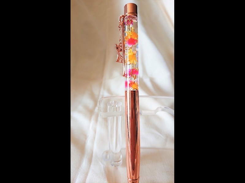 お好きな花材を選んでお好きな葉形に加工したゴールドワイヤーに貼りチャームホール付きピンクゴールドボールペン
