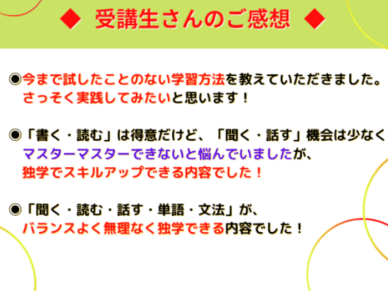 A:ご安心ください。お伝えする学習方法はとてもシンプルな流れになります。同じ内容を練習しても、一人一人の上達は違います。あなたの英語上達への学習ステップに合わせて、レッスンを進めていきますので、安心してご受講ください。