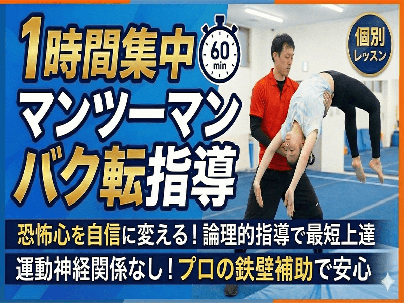 そんなお悩みを持つ方のための、完全オーダーメイドの個別レッスンです。 これまで数多くの受講者を「バク転成功」へと導いてきたプロ講師を、1時間独り占め。