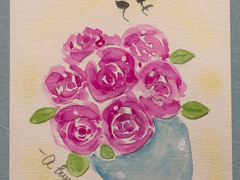 楷書にとらわれず、先生から「崩した遊び心のある文字」をご指導いただいたおかげで、のびのびと自由に表現できました。絵を添えることで芸術的な仕上がりになり、家族にも自慢してしまったほどです。