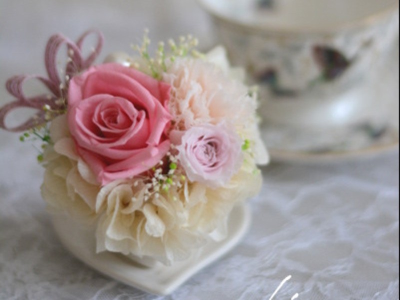 枯れないお花プリザーブドフラワーミニアレンジを作ります。フラワーアレンジの基本を楽しく学べます。簡単ラッピングあり☆