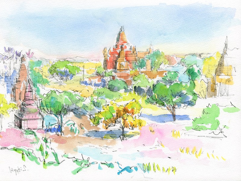 紙の白を活かして、奥行きを表現し、味のある線と鮮やかな色が特徴の「淡彩スケッチ」(A4サイズより少し大きめなサイズ)が2時間〜2時間半で描けるようになります。