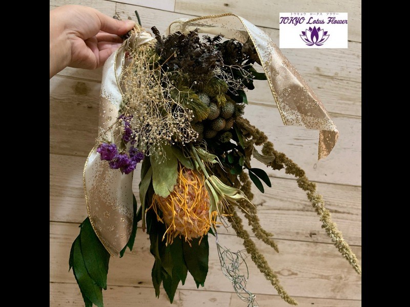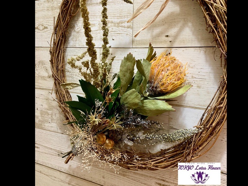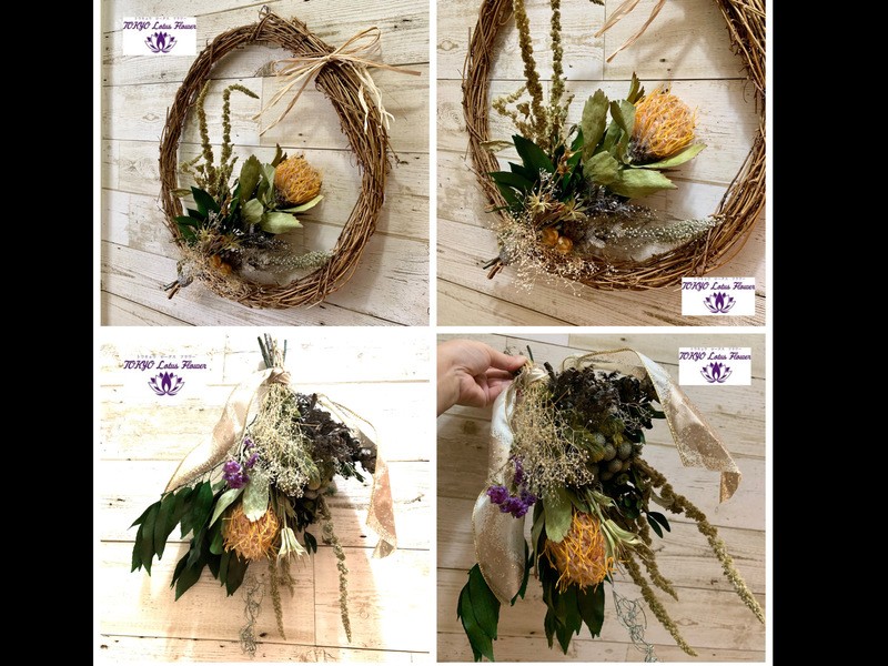 90分で、ボタニカルかドライブフラワーの40㎝リースかリース無しのスワッグか3つからお選び下さい。高級なプリザーブドやドライフラワーを使用