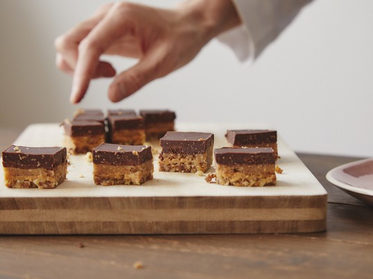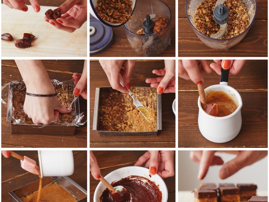 チョコは4層。ナッツ部分、ピーナッツバター、ヴィーガンキャラメル、チョコレートを組み合わせていきます。