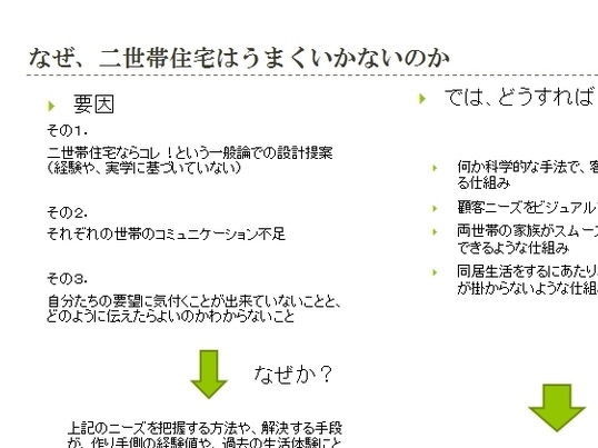 二世帯住宅のリアルを知りたいと思い参加しました。講師の方も二世帯住宅に居住されているということで、とても現実的なお話が聞けたと思います。二世帯住宅を考えるにあたり、ついつい建物などのハード面を重視しがちですが、実はソフト面であるお互いの生活スタイルを把握することが一番大切というお話はまさに目からウロコでした。