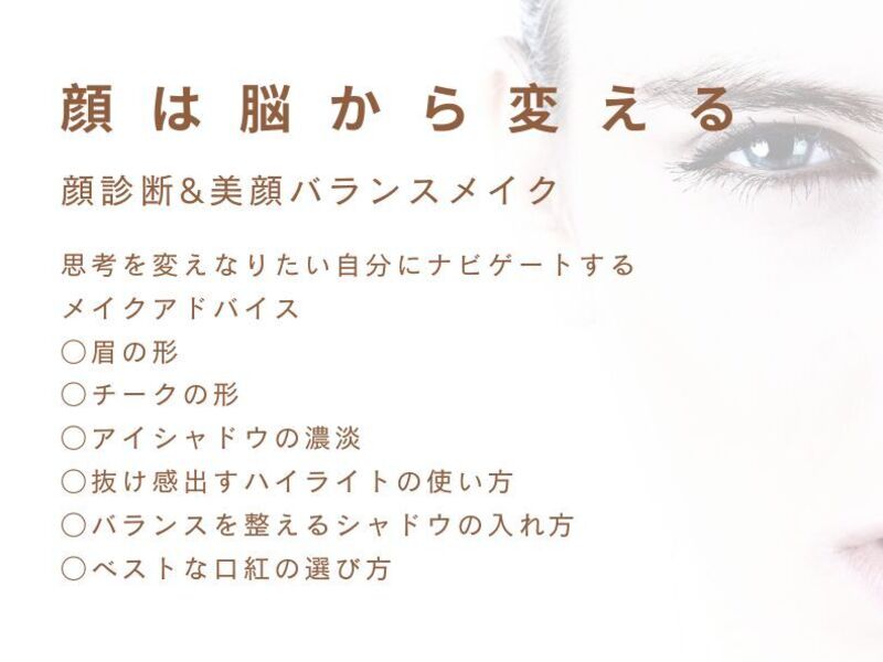 自分の顔の特徴や、相手が受ける印象が知れて、自分を客観的に理解することができました。また普段、自己流になってしまっているメイク方法が合っているのか、もっとどうするとより良いのかを丁寧に教えて頂けました。顔の歪みにも悩んでいましたが解決方法を教えて頂けたり、自分に似合う色味も教えて頂けたり、為になるお話ばかりでした!