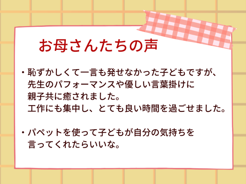 シャイな子供も作りながらだんだんと話すようになり、楽しそうに作っていました。これからイラっとした時にパペットを使って話してみようと思います。そして自分へも(笑)こちらの接続が悪くご迷惑をお掛けしました。有難うございました。