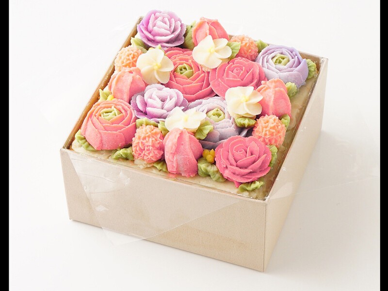 お花絞り初心者でも最終的にボックスケーキを作れるようになると思います。お花の色は自分で決めることが出来ますが、感染症対策かもしれませんが実際にクリームに天然色素を入れるのは殆ど先生で、都度濃さを確認しながら色作りをする感じでした。
