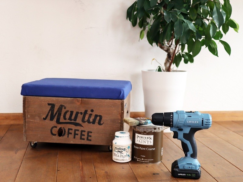 ステンシル模様が可愛い大容量のスツールBOXです!座面はタッカーを使用して留めます。小物を置いてサイドテーブルとしても使用できます。
