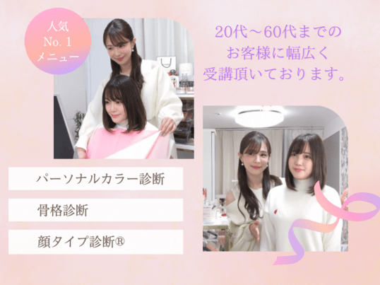 かなり急な予約をしてしまいましたが親切に対応頂きました。パーソナルカラー診断は自分ではわからなかったカラーが合うことなど新しい発見がたくさんありました。骨格診断では実際に先生と一緒にじっくり診断していただき自己診断のものと全く違った結果で自分が悩んでいたことが解決されました。
