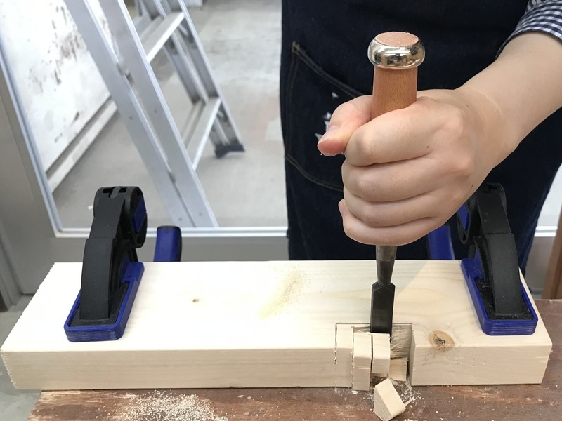 最後にダボ打ち仕上げの方法、のみを使って相欠け継ぎまで実践でやらせていただき、にわか大工になった気分でした。先生のようにきれいにできるようになりたいです。