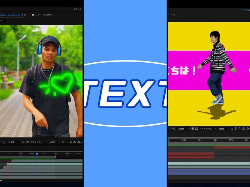 実写を使って合成処理、映像とテキストのモーショントラッキング処理など。