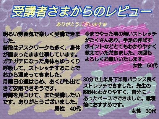 全身ストレッチ出来たおかげで終了後は身体が緩みよく眠れました!また参加させてください。よろしくお願いいたします。