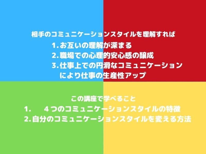 コミュニケーションをタイプ別に分け、アプローチの方法を変えていくという考え方が初めて知り、大変学びとなりました。ありがとうございました。